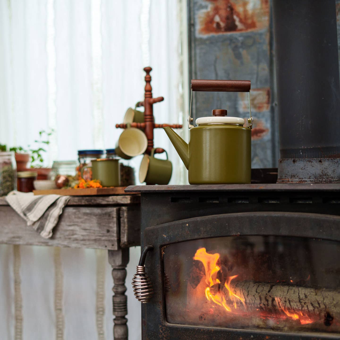 The Barebones enamel 2-tone kettle features a beautiful bulky walnut handle and pull-top, speckled white lid, and olive drab body. Use this vintage-inspired kettle for steeping tea, warming cocktails, simmering broth, and boiling water for hot chocolate and coffee. It’s durable enough for your dinnerware camp set and elegant enough for indoor use--stored on the stove next to your favourite cast iron.