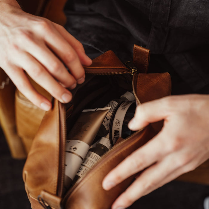 The Leather Dopp Kit made from full-grain cowhide is an example of functionality and slow fashion. Comes with water-resistant nylon for easy cleaning and durable brass hardware. Travel in style and with confidence.