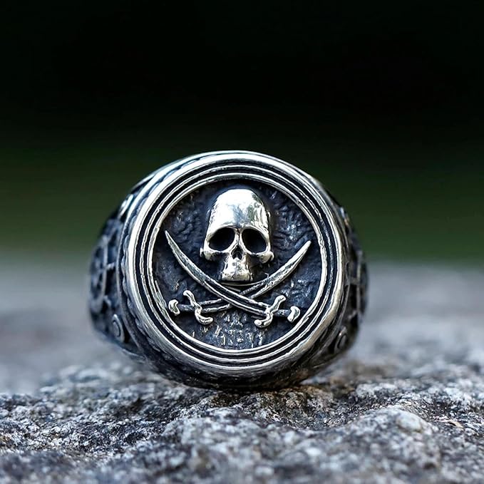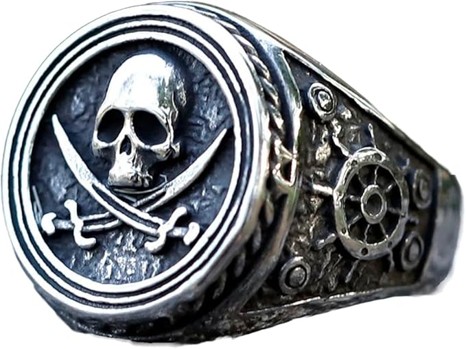 Embrace bold style with the Circle Skull & Swords Ring, featuring a striking skull encircled by crossed swords and a detailed ship wheel on the side. This daring accessory adds an edge to any outfit, perfect for those who dare to stand out. Crafted for impact and attitude, it’s a fearless statement piece that channels adventure and rebellion.